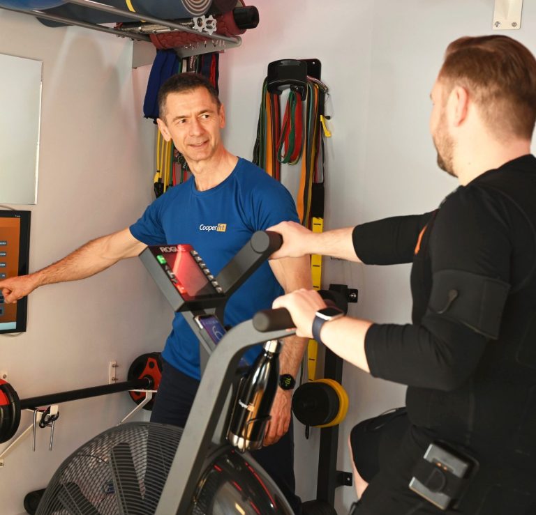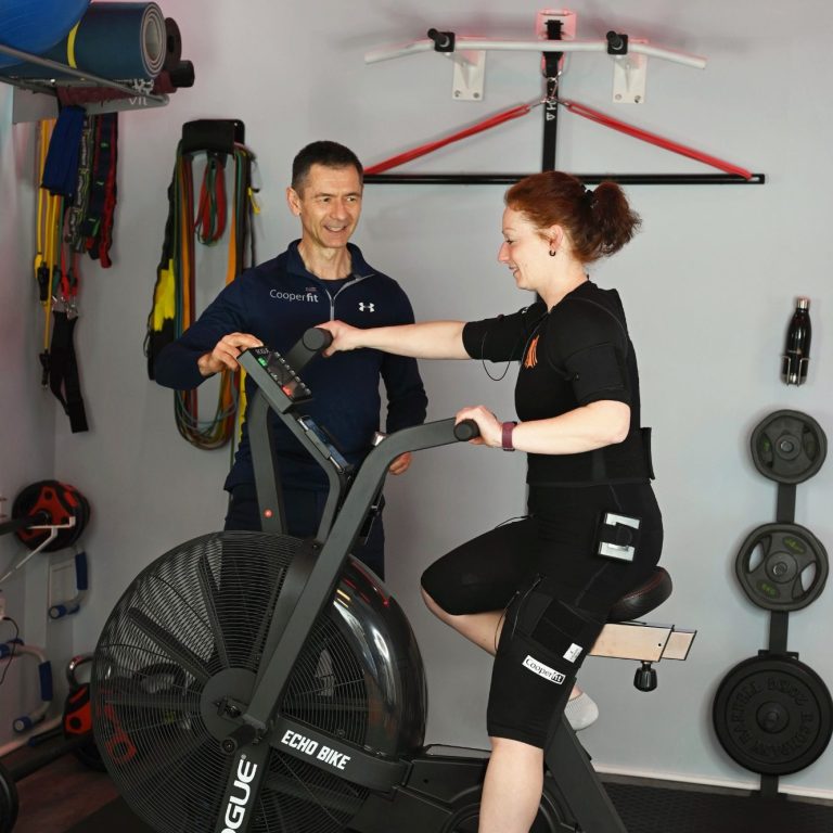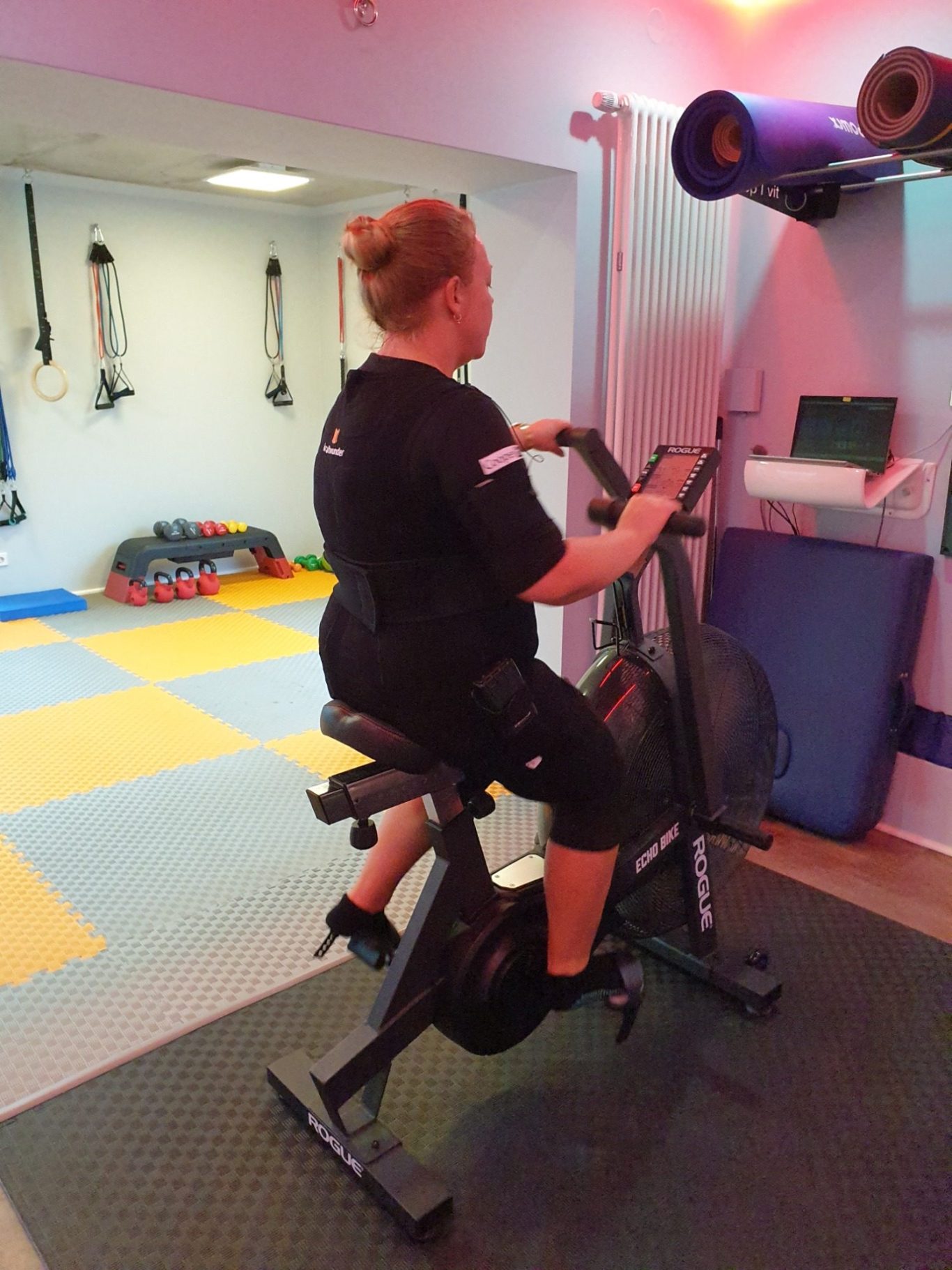 Air-Bike-Intervalltrainings mit einem EMS-Fettverbrennungsprogramm.